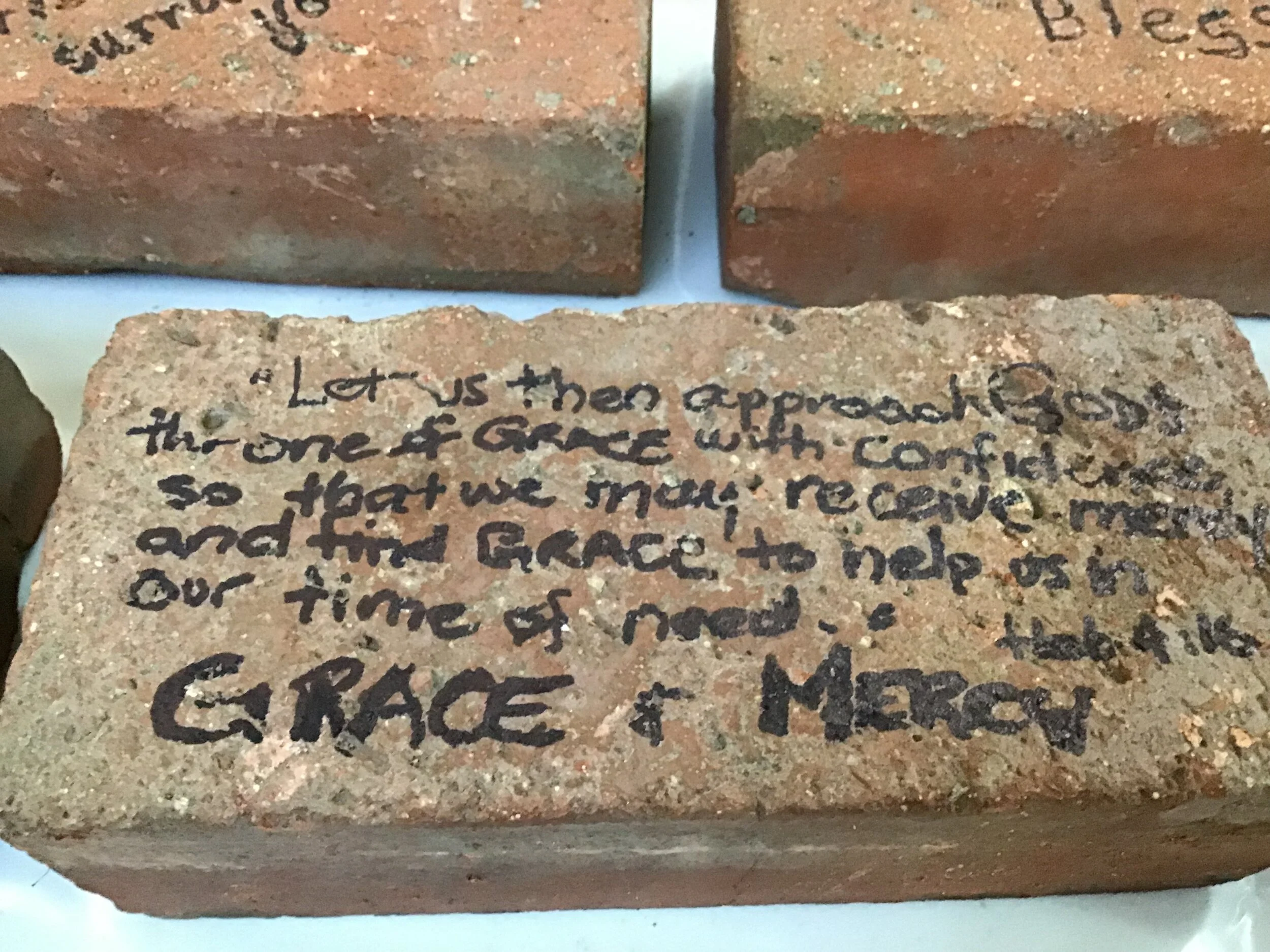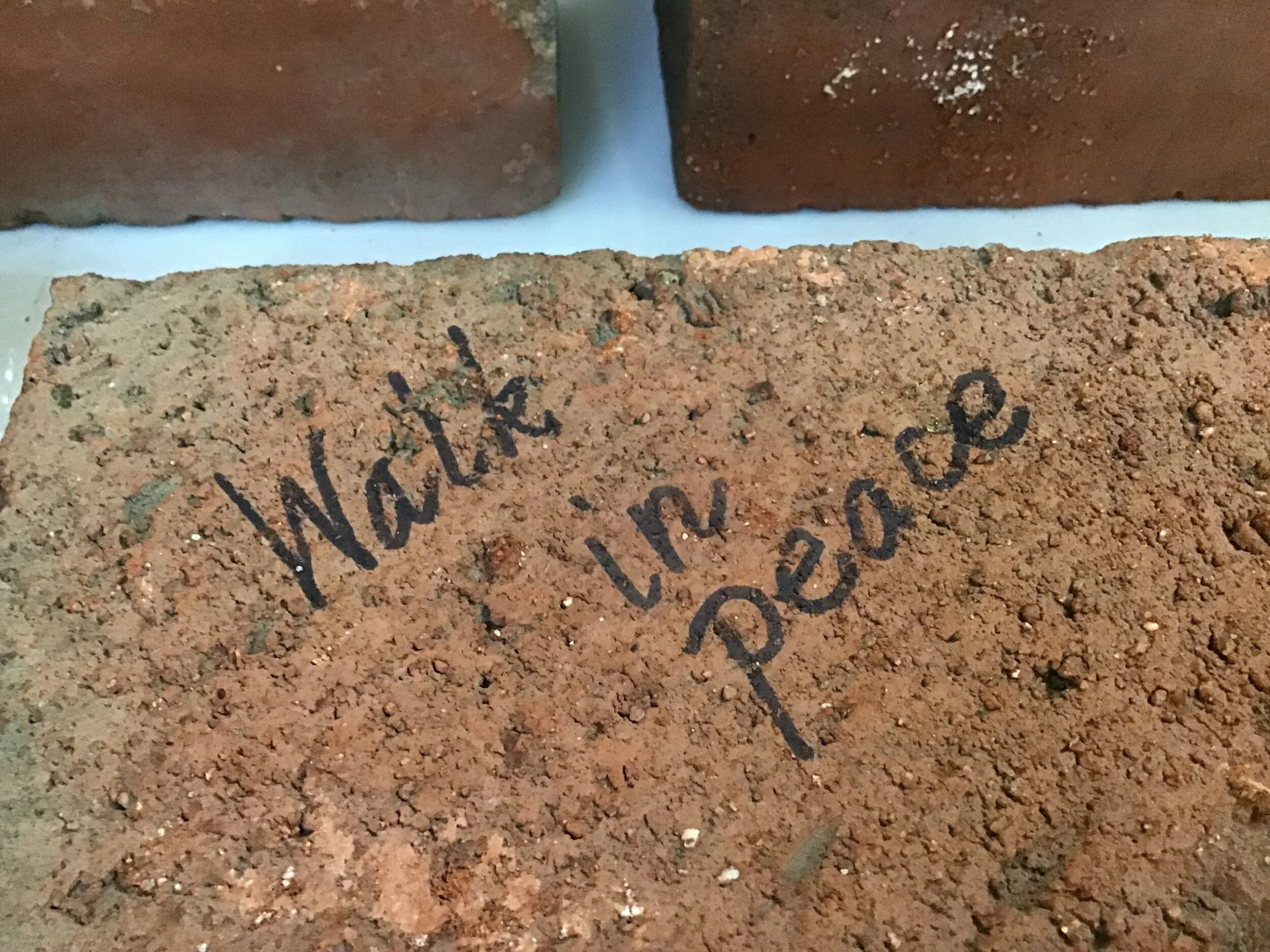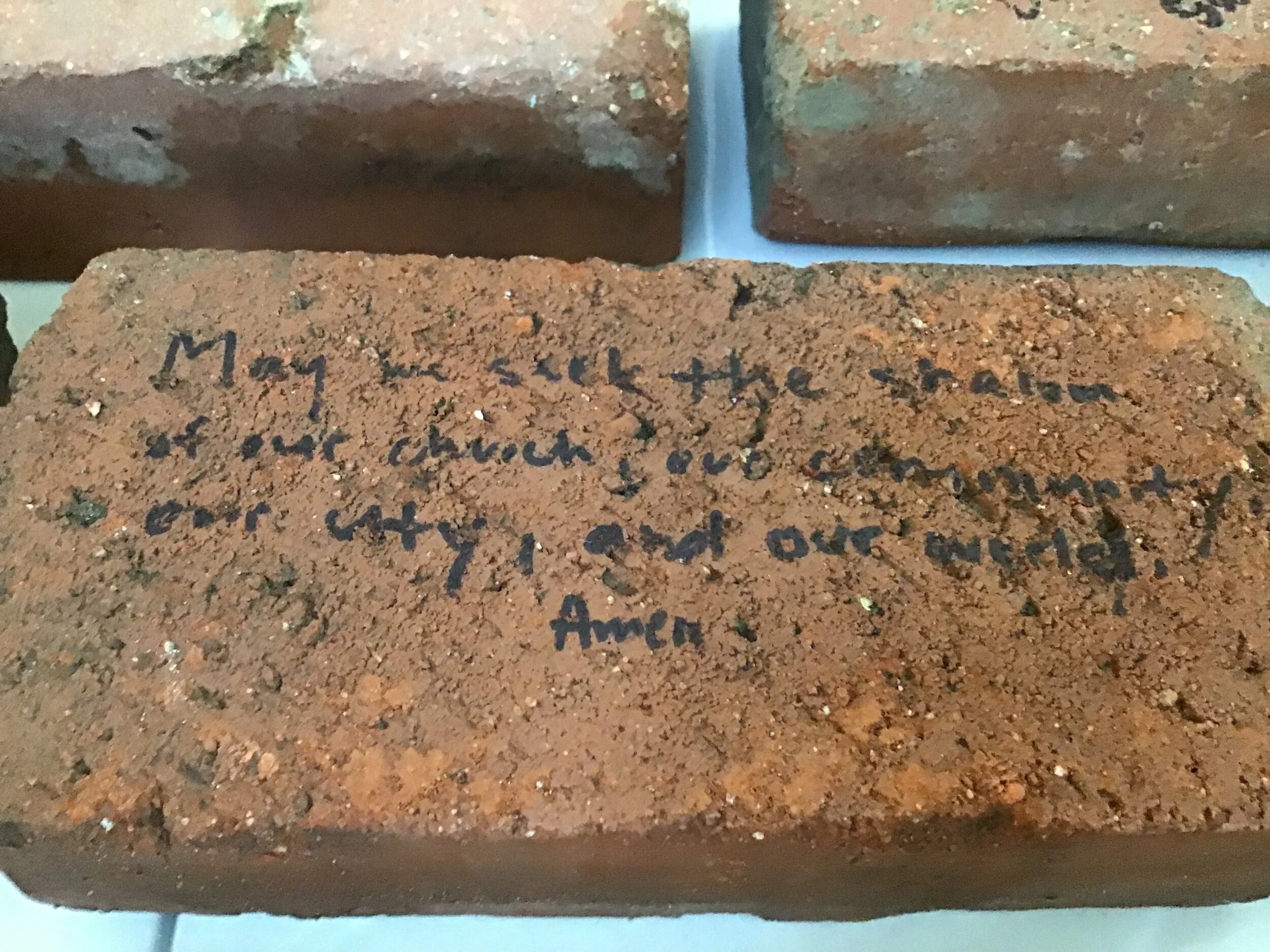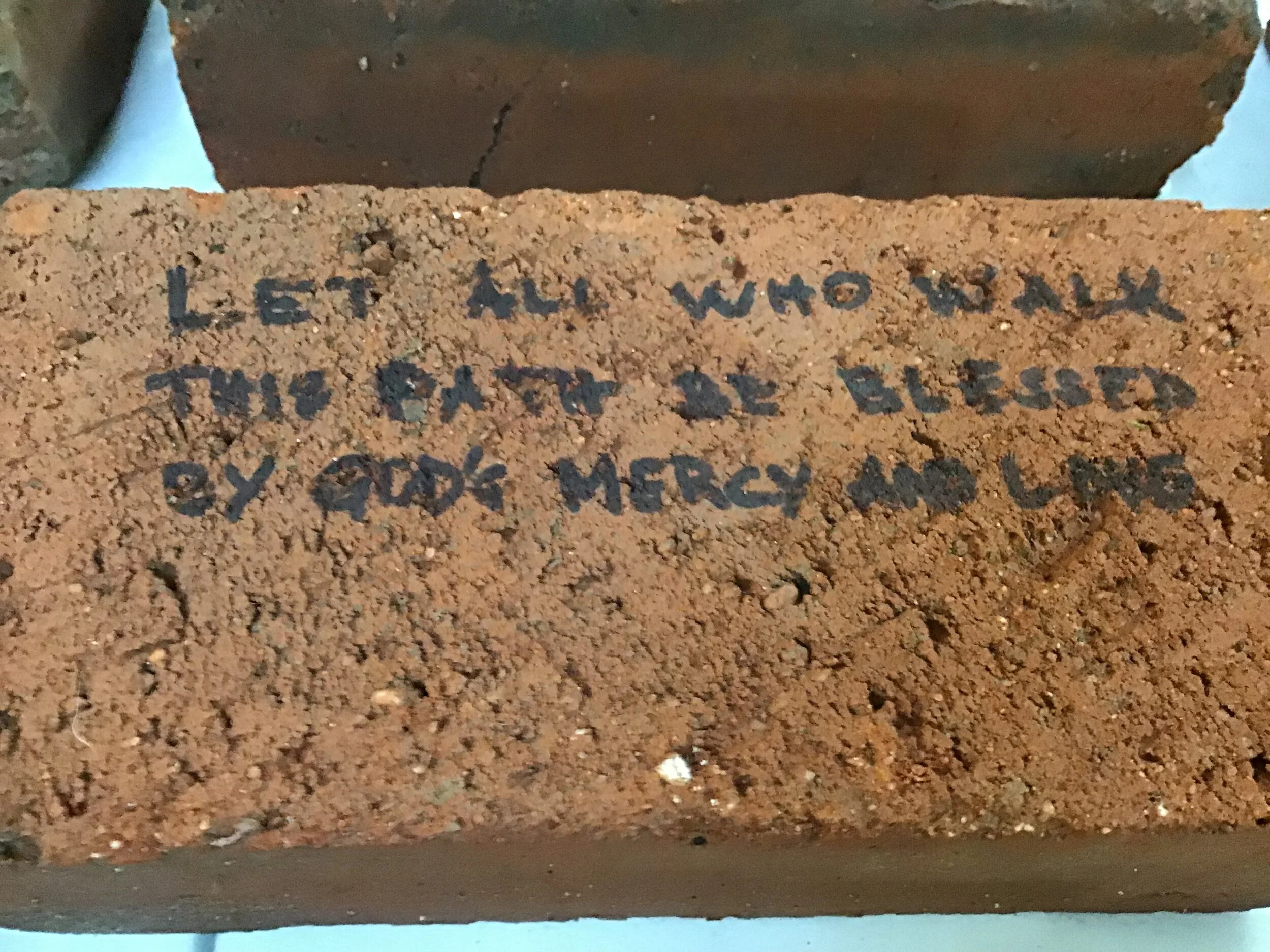 The walking path of the labyrinth is grass, while the outline of each of the labyrinth’s five circuits are bricks inlayed into the grass. Members of the congregation wrote prayers of blessing for the church and the neighborhood, which lie face-down on bricks that line the entrance to the labyrinth.