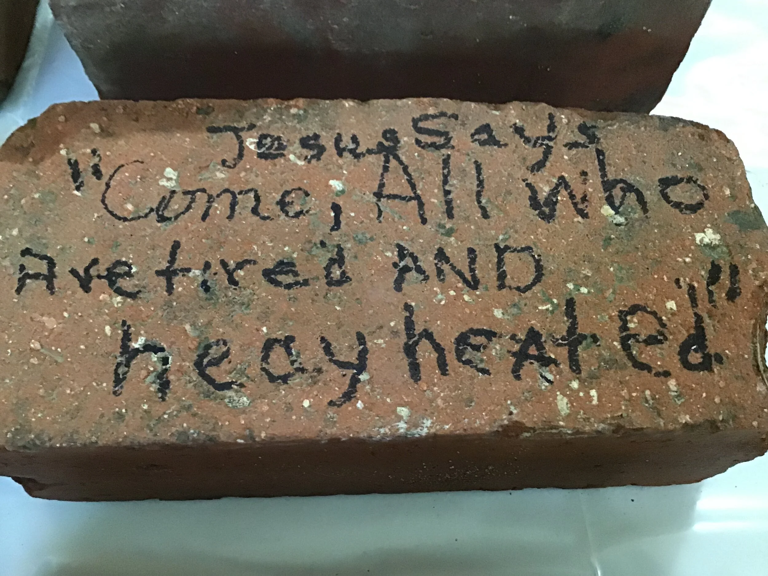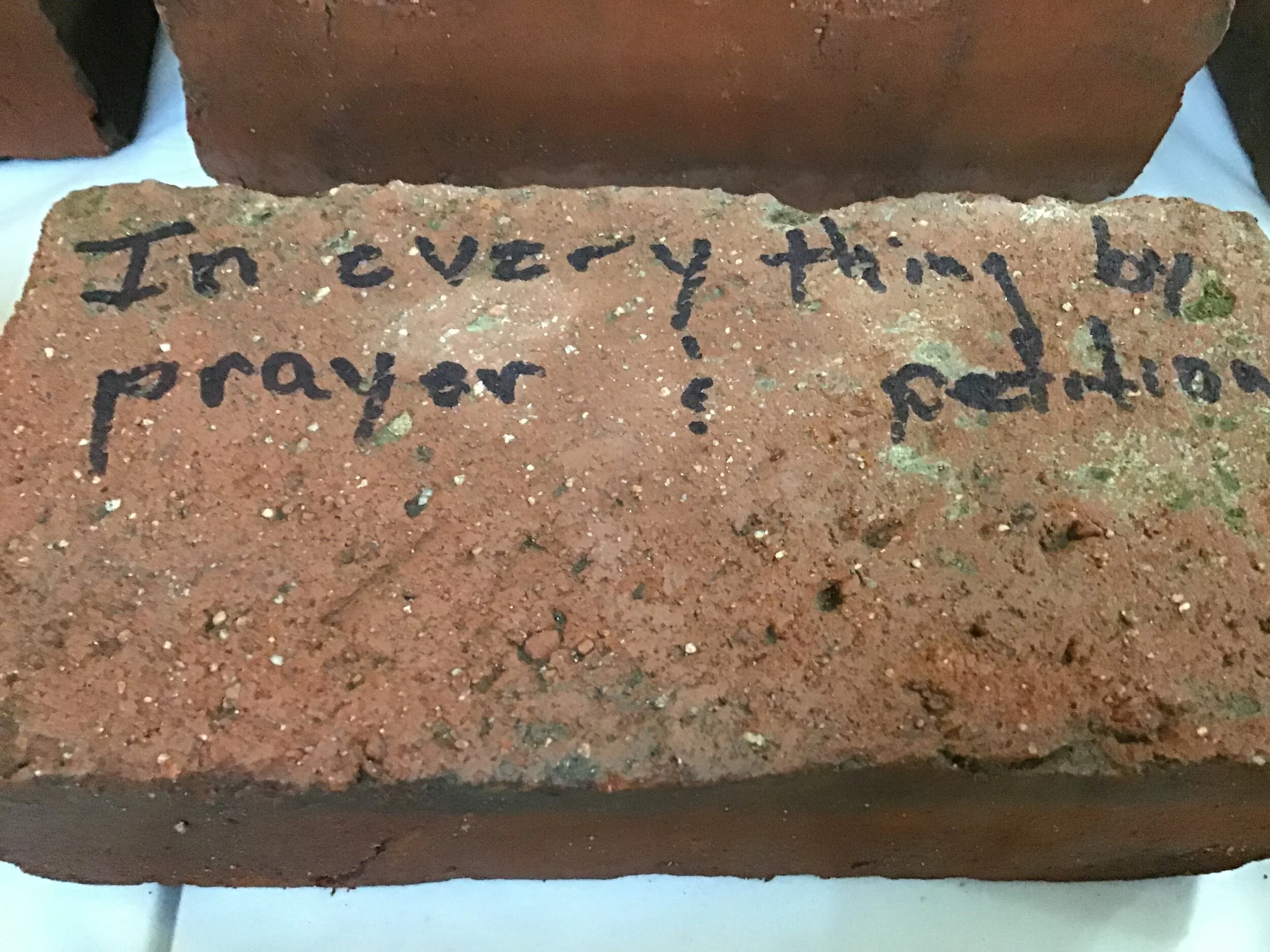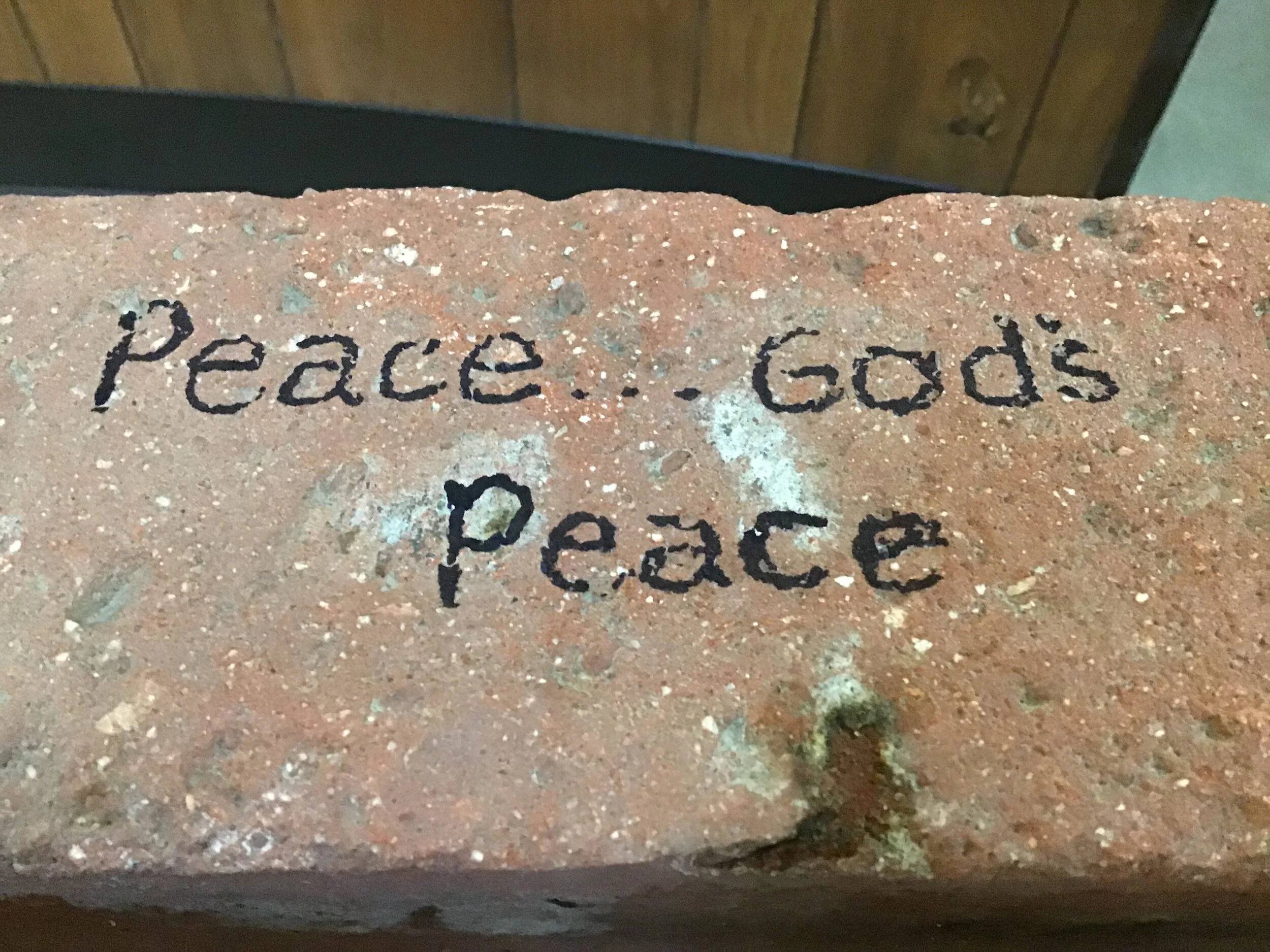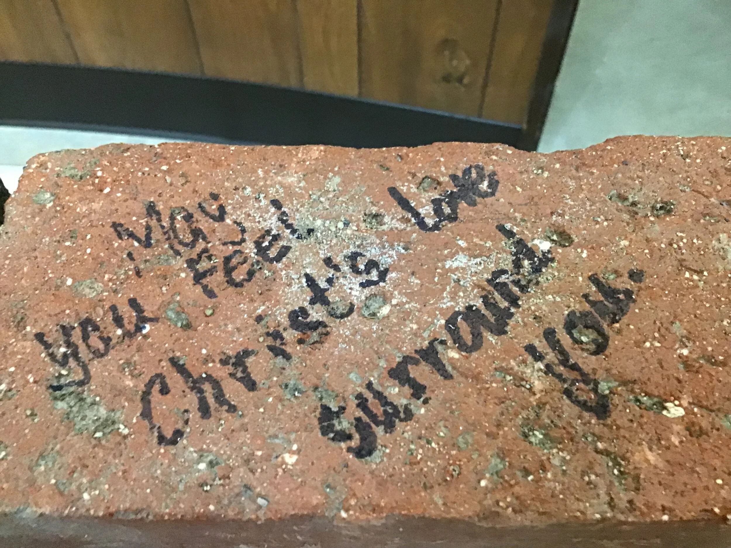 The walking path of the labyrinth is grass, while the outline of each of the labyrinth’s five circuits are bricks inlayed into the grass. Members of the congregation wrote prayers of blessing for the church and the neighborhood, which lie face-down on bricks that line the entrance to the labyrinth.