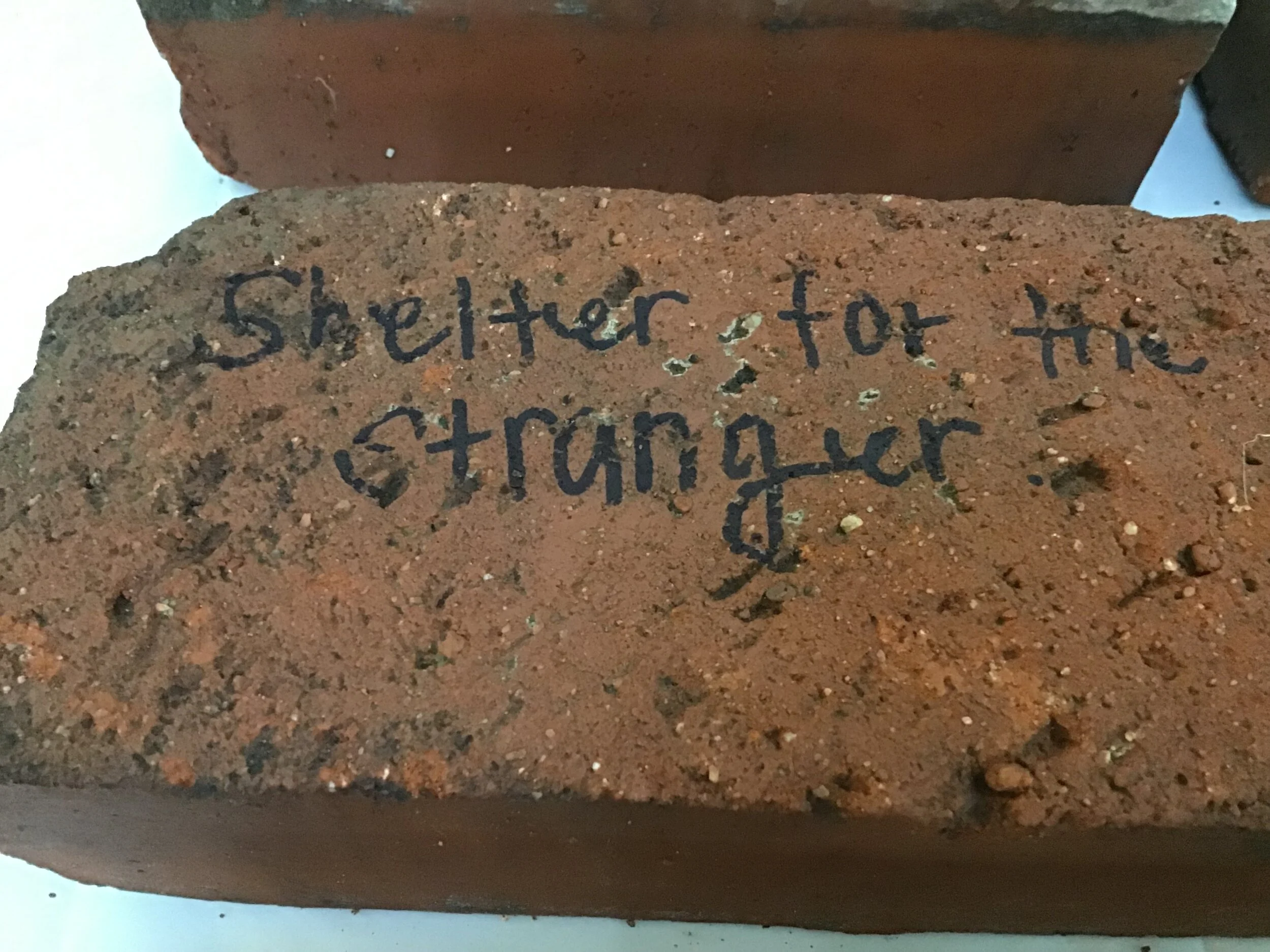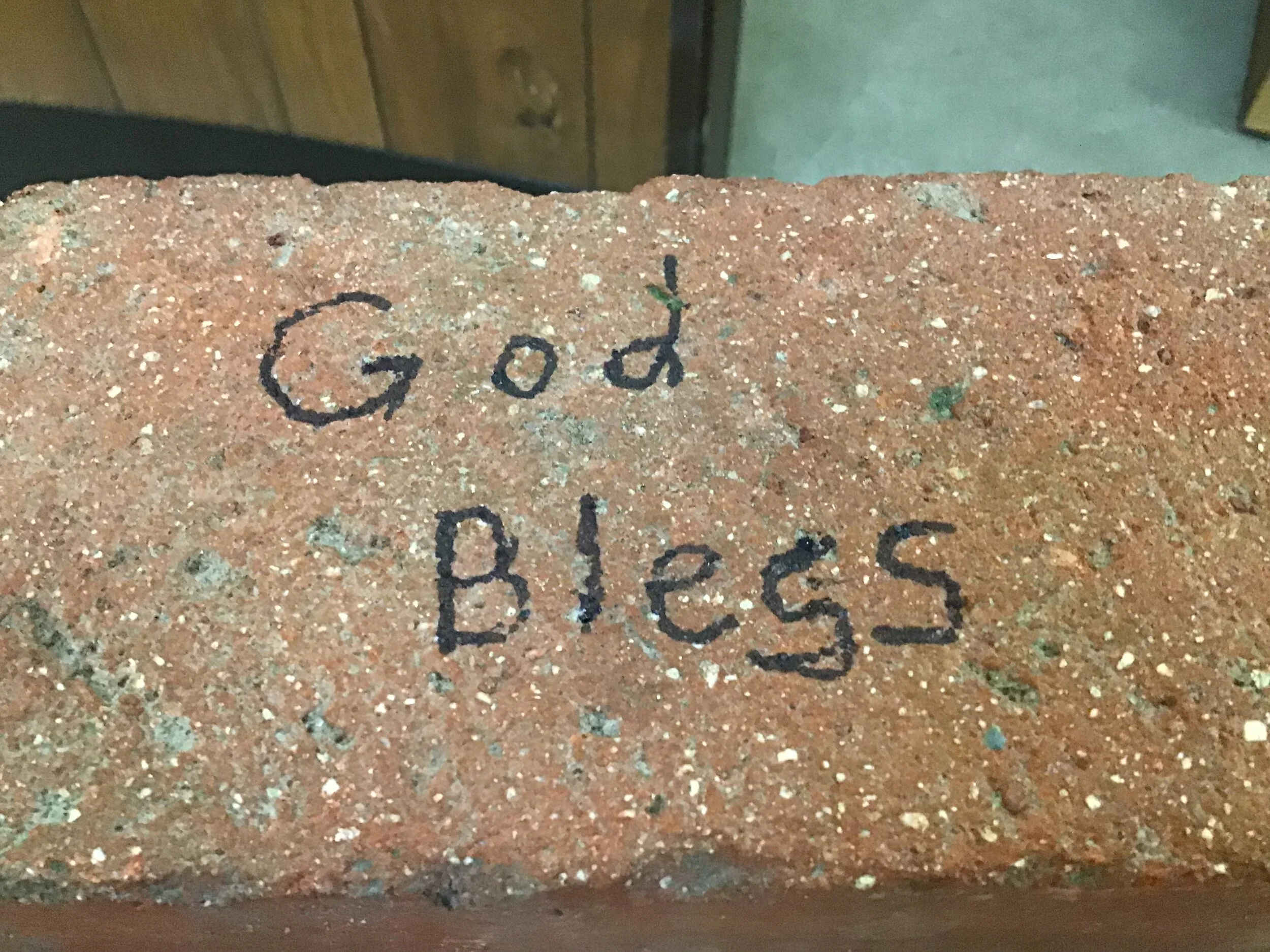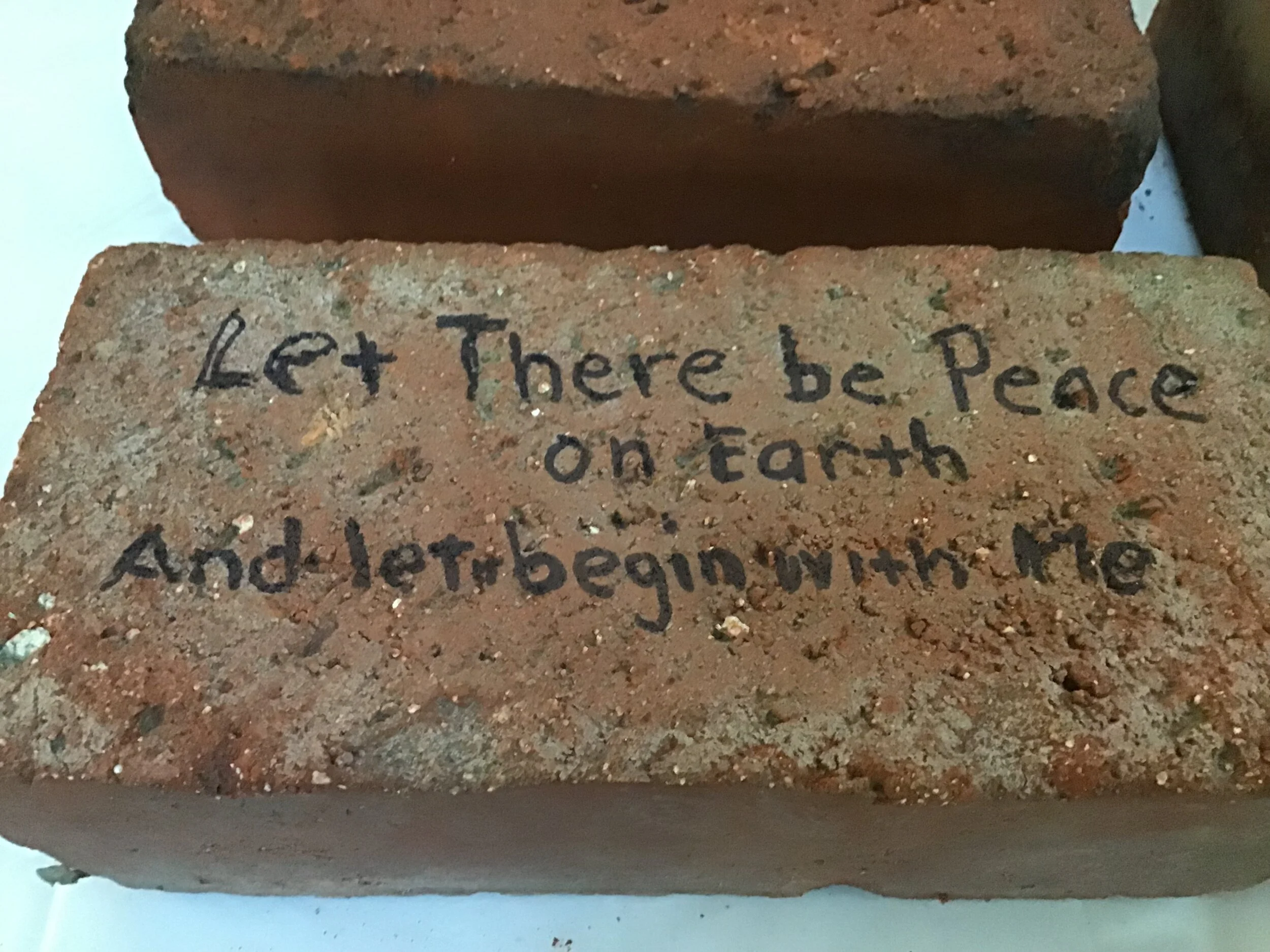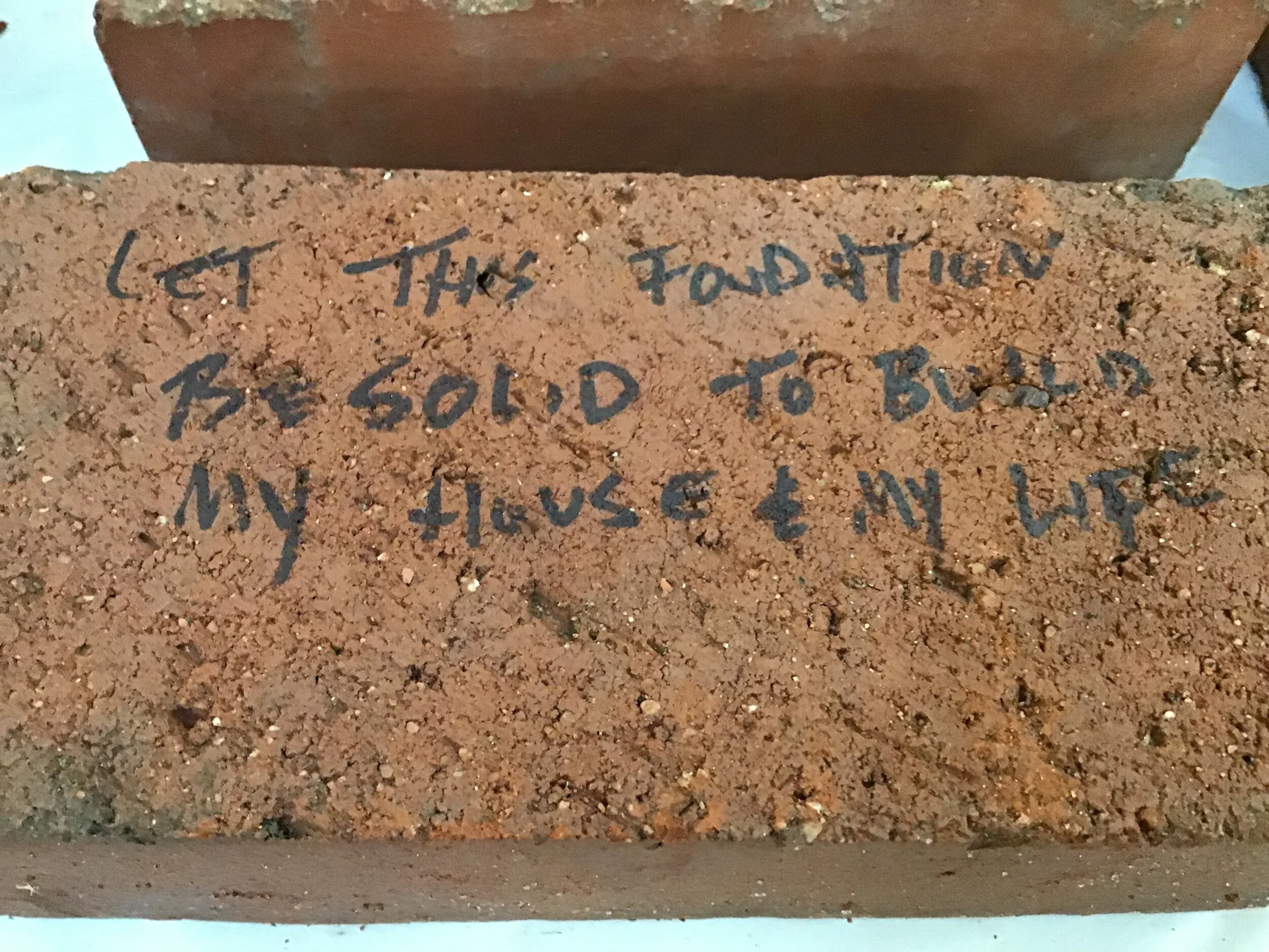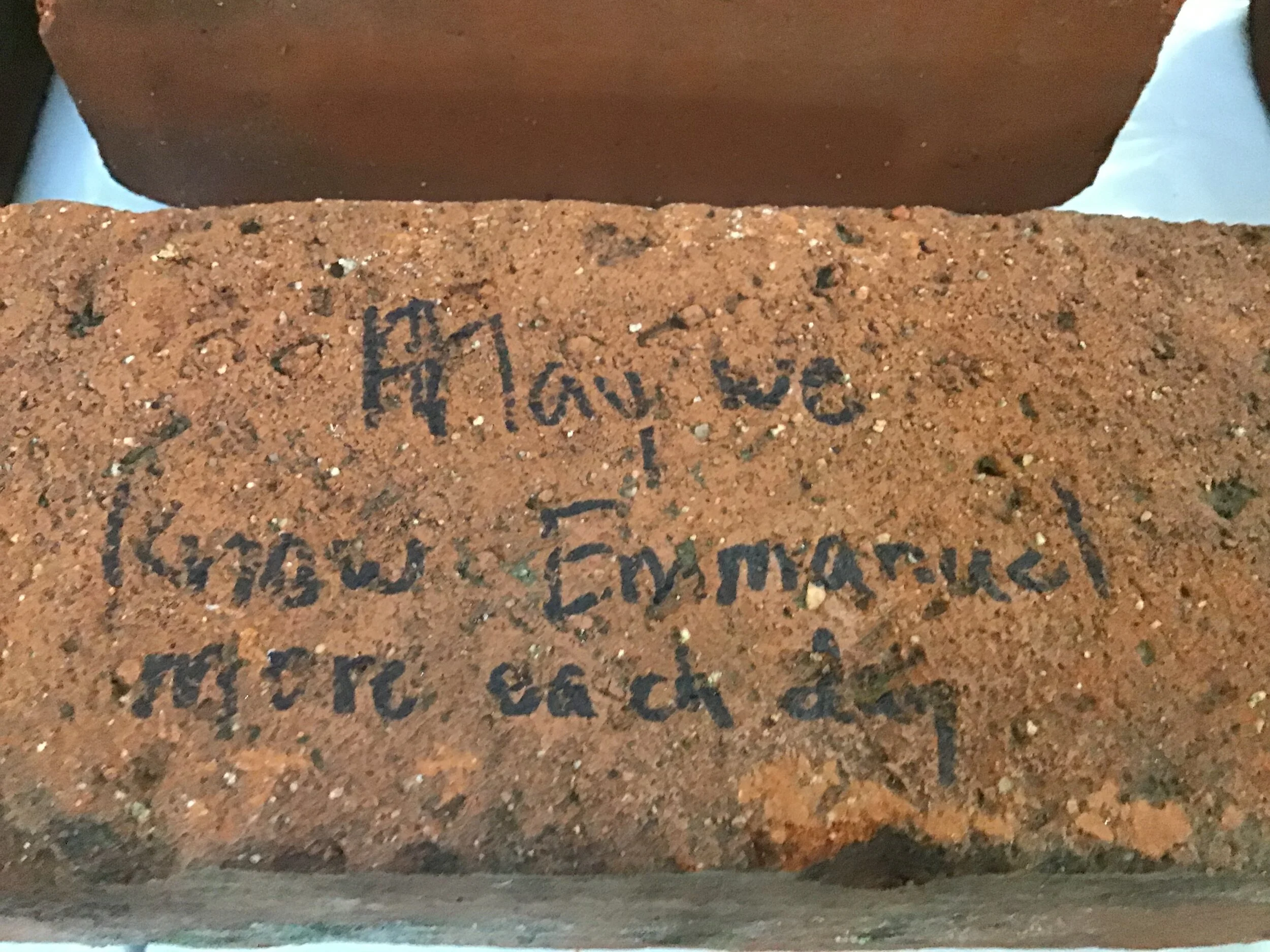 The walking path of the labyrinth is grass, while the outline of each of the labyrinth’s five circuits are bricks inlayed into the grass. Members of the congregation wrote prayers of blessing for the church and the neighborhood, which lie face-down on bricks that line the entrance to the labyrinth.
