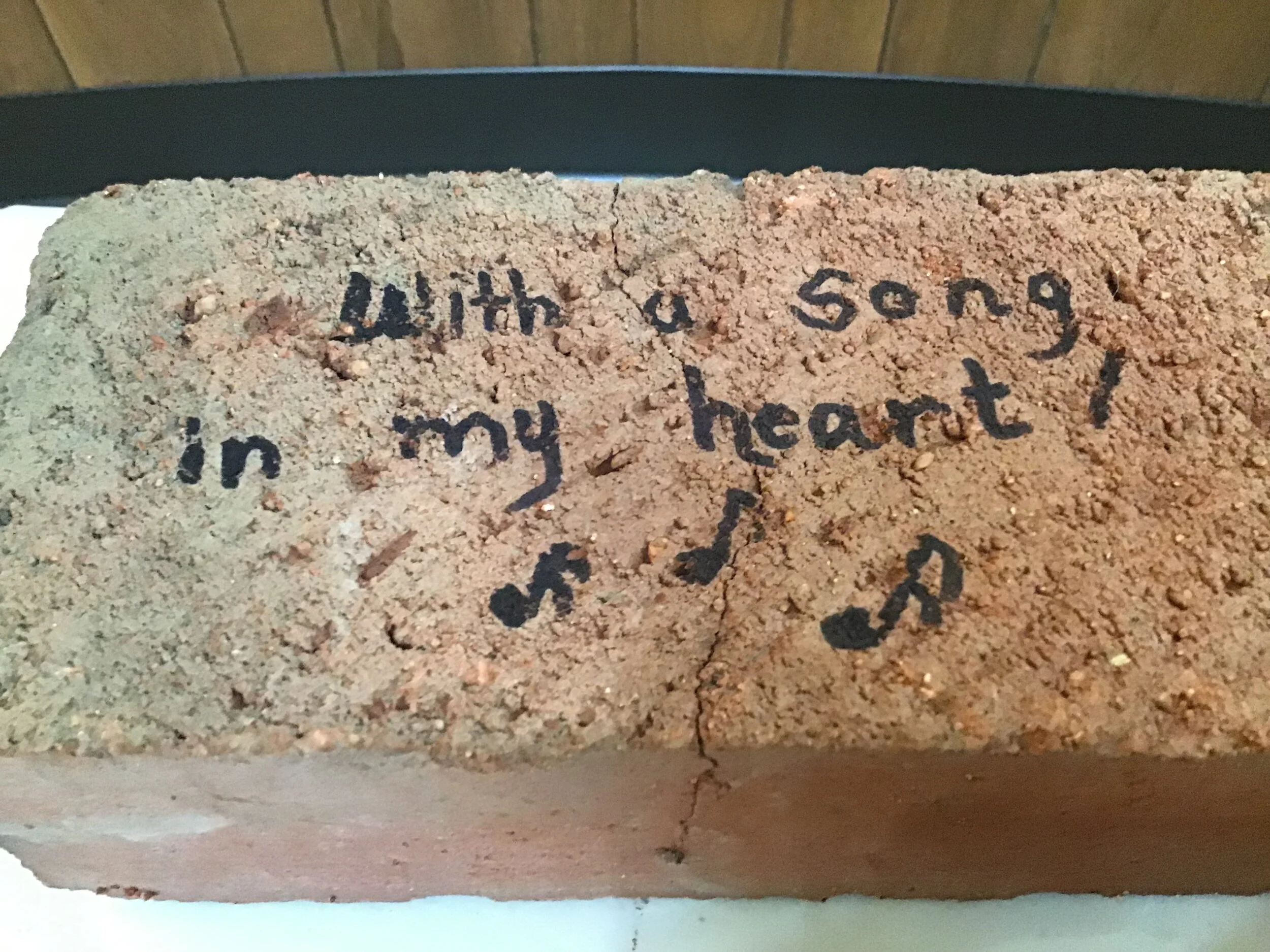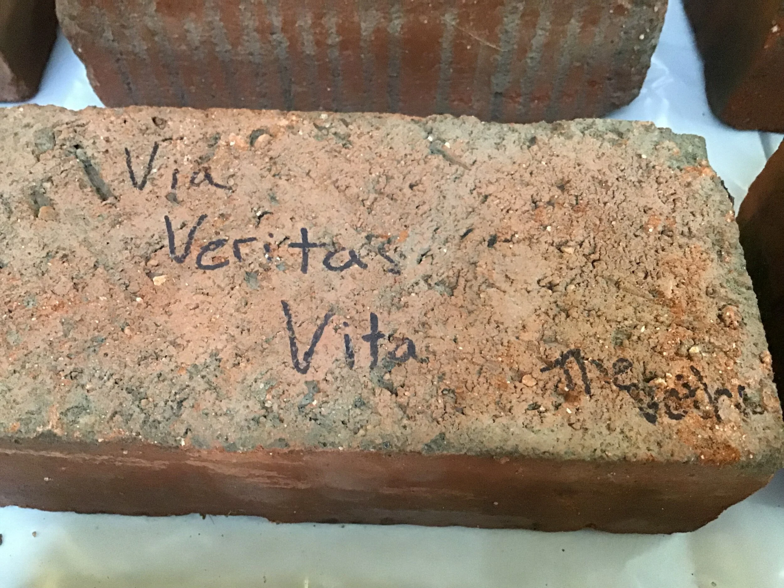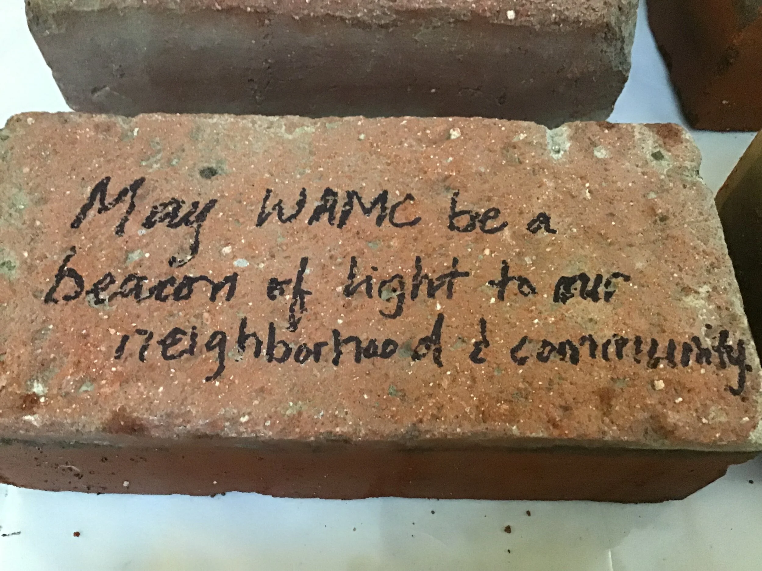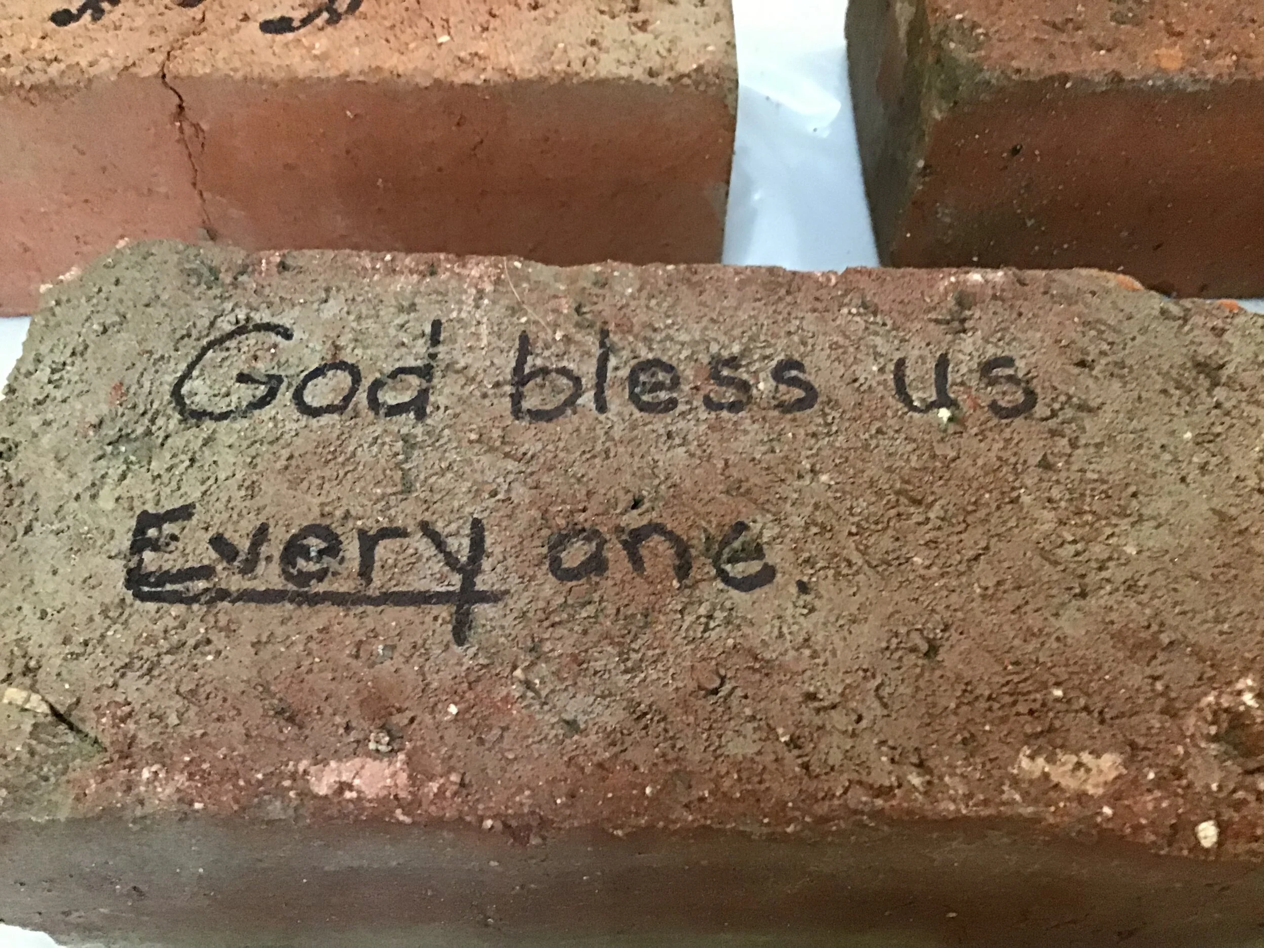 The walking path of the labyrinth is grass, while the outline of each of the labyrinth’s five circuits are bricks inlayed into the grass. Members of the congregation wrote prayers of blessing for the church and the neighborhood, which lie face-down on bricks that line the entrance to the labyrinth.