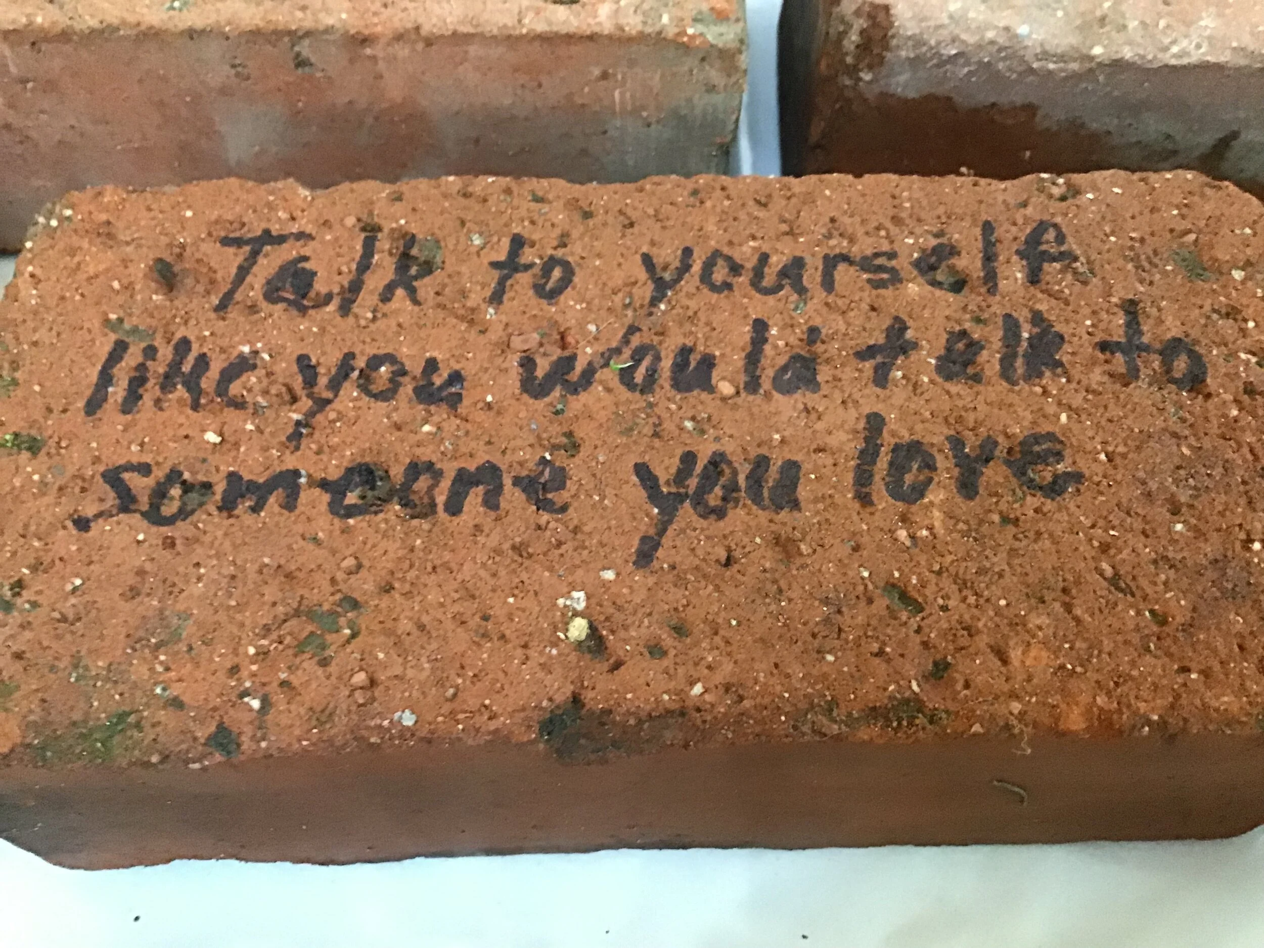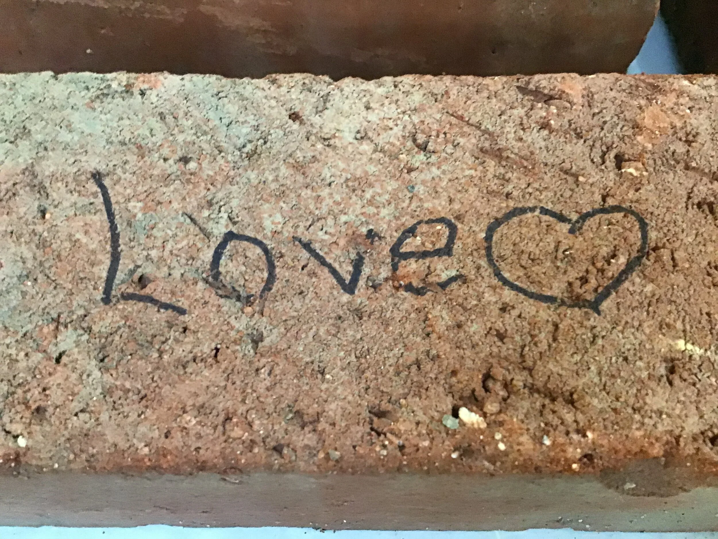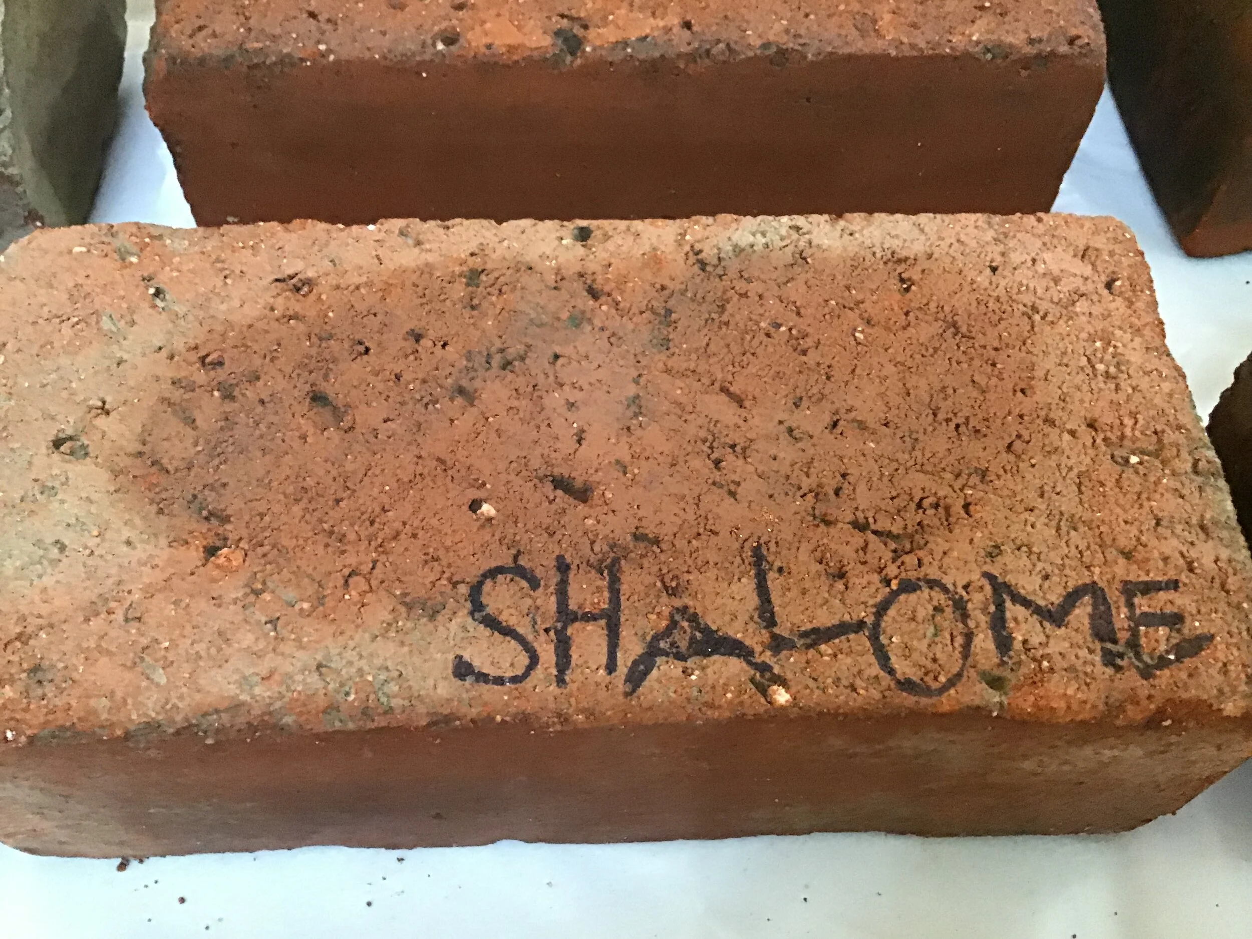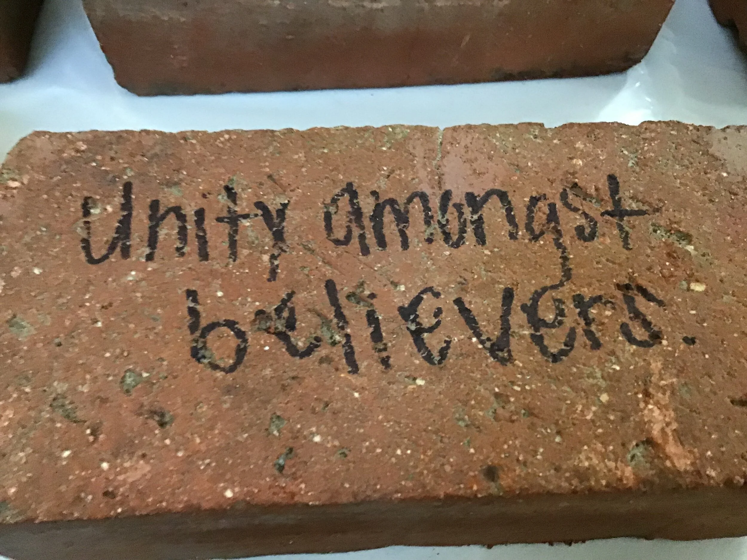 The walking path of the labyrinth is grass, while the outline of each of the labyrinth’s five circuits are bricks inlayed into the grass. Members of the congregation wrote prayers of blessing for the church and the neighborhood, which lie face-down on bricks that line the entrance to the labyrinth.