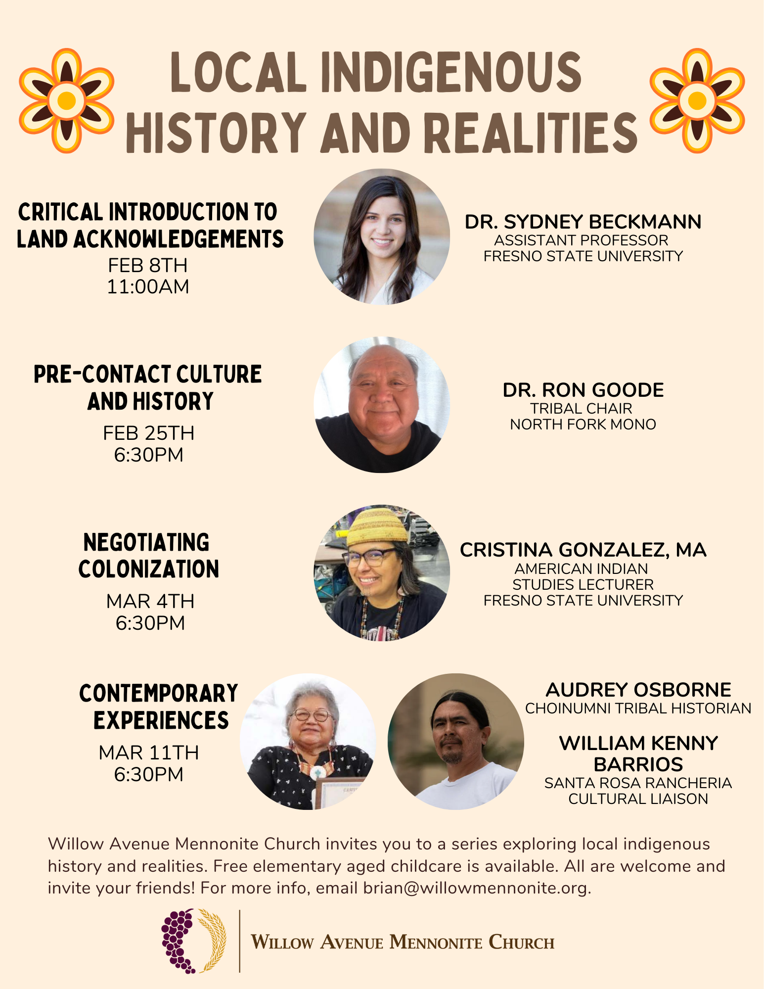 As an outgrowth of our commitments to welcome all, follow Jesus, and foster wholeness, Willow Avenue Mennonite Church is excited to host a series on Local Indigenous History and Realities. This grows out of congregational discernment about adopting a land acknowledgment statement. A flyer for the series is below as are videos of presentations in the series that have already happened. All are welcome for these important conversations.